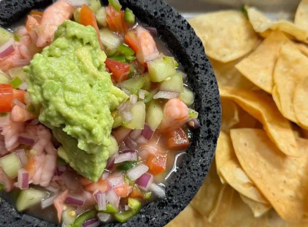 Ceviche is a refreshing vibrant dish made with fresh shrimp, tomatoes and cucumber. Served with our crispy house made chips. A large portion that can easily be shared.